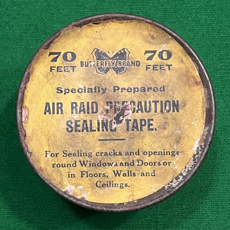 Tin with contents of ' Butterfly Brand ' ARP Sealing Tape. Intended to be used to make rooms gasproof by sealing all joints etc., they were later rebranded for use as window reinforcement against flying glass. Good, used condition with stained label. Interestingly the tin has been remanufactured from an ' OXO ' cube tin as evidenced by the printing to the interior.