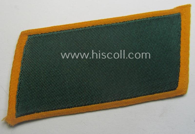 The neat - albeit regrettably single - collar-tab (ie. 'Kragenspiegel') - which is nicely and entirely executed in the so-called: 'BeVo-weave technique' - is piped in the golden-yellow- (ie. 'goldgelbener'-) coloured branchcolour, being the designated branchcolour as was given to the: 'Armenischer'- (ie. Armenian) volunteers serving within the 'Deutsche Wehrmacht'. The piece came in a just folded but not trimmed condition and came as 'straightly cut-off the role': it is void of the interwoven (or added), silver-grey-coloured 'NCO'-braid denoting that is was intended for a simple soldier with the rank of a: 'Soldat' (ie. 'SchĂŒtze'). The tab was (I deem) simply never used nor tunic-attached but does show some minimal age and/or minimal staining. It should be noted that these original, 'officially German-issued' collar-tabs as entirely executed in 'BeVo'-type weave (ie. being of the German manufacture by the company of 'BeVo'!) can easily be graded 'scarce'. I deem that this attractive EM-pattern, 'Ostvölker'- ie. Armenian-collar-tab is accordingly priced!