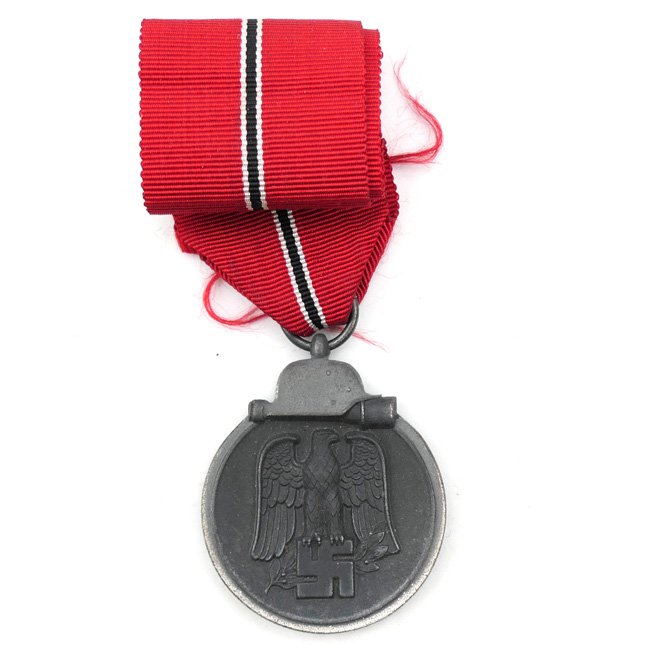 German Eastern Front Medal (Medaille für die Winterschlacht im Osten). The German Eastern Front Medal (Medaille für die Winterschlacht im Osten) was instituted on 26 May 1942 to commemorate the first winter campaign in Russia, operation Barbarossa. The medal was also known as the 'Frozen Meat Medal'. Approximately 3 million examples have been awarded. The medal is maker marked with number '13' indicating production by the company of 'Gustav Brehmer' from Markneukirchen. The medal is complete with its original ribbon as found. Nice example in good condition!