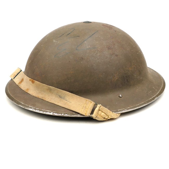 Canadian MK II Combat Helmet. The helmet is complete with liner and khaki chinstrap. The liner is in good used condition. The shell is nicely marked with 'C.L./C.' indicating production by the company 'Canadian Lamp Company' and dated 1940. The helmet retains most of its original brown/olive drab coloured paint. The helmet is in uncleaned condition as recently found in France. Nice original Canadian MK2 helmet in good condition!