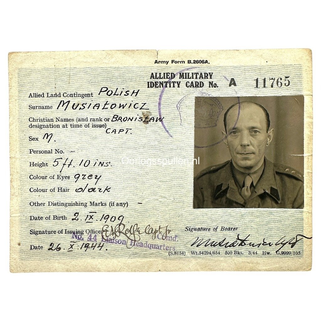 This Allied military identification card is in good condition, complete with passport photo and belonged to a Polish captain who fought for the Allies.The ID card dates back to 1944 and was used by Bronistaw Musiatowicz.After the German and Soviet invasion of Poland in September 1939, much of the Polish army and government fled abroad.Many joined the Allies to continue the fight against the Axis powers.All over the world, Polish soldiers fought in various units – from North Africa to Western Europe.One of the best-known Polish formations was the 1st Polish Armored Division under General Stanisław Maczek.This division played a key role in the liberation of parts of France, Belgium and the Netherlands.In the air, Polish pilots distinguished themselves during the Battle of Britain.Especially the famous 303 Squadron of the RAF gained great fame.Poles also fought on other fronts, such as in Italy.One example is the tough battle for Monte Cassino in 1944.Despite their great contribution, Poland was not recognized as a full-fledged victor after the war.The country came under Soviet influence.Nevertheless, the efforts of Polish soldiers are recognized worldwide as courageous and indispensable in the fight for the liberation of Europe.An interesting ID card for the Polish World War II collection!Article number: 15967Originele WWII Geallieerde identificatiekaart van Poolse kapitein uit 1944Deze Geallieerde militaire identificatie kaart is in goede conditie, compleet met pasfoto en behoorde foto een Poolse kapitein welke voor de Geallieerden vocht.De ID kaart dateert uit 1944 en werd gebruikt door Bronistaw Musiatowicz.Na de Duitse en Sovjet-invasie van Polen in september 1939 vluchtte een groot deel van het Poolse leger en de regering naar het buitenland.Velen sloten zich aan bij de Geallieerden om de strijd tegen de Asmogendheden voort te zetten.Over de hele wereld vochten Poolse soldaten in diverse eenheden mee – van Noord-Afrika tot West-Europa.Een van de bekendste Poolse formaties was de 1e Poolse Pantserdivisie onder generaal Stanisław Maczek.Deze divisie speelde een sleutelrol bij de bevrijding van delen van Frankrijk, België en Nederland.In de lucht onderscheidden Poolse piloten zich tijdens de Slag om Engeland.Vooral het beroemde 303 Squadron van de RAF verwierf grote bekendheid.Ook op andere fronten, zoals in Italië, vochten Polen mee.Een voorbeeld hiervan is de zware strijd om Monte Cassino in 1944.Ondanks hun grote bijdrage werd Polen na de oorlog niet erkend als volwaardige overwinnaar.Het land kwam onder Sovjetinvloed te staan.Toch wordt de inzet van Poolse soldaten wereldwijd erkend als moedig en onmisbaar in de strijd voor de bevrijding van Europa.Een interessante ID kaart voor de Poolse Tweede Wereldoorlog collectie!