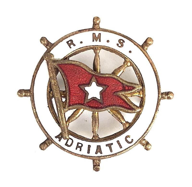 A very scarce original circa pre 1934 period 'R.M.S. Adriatic gilt and enamel pin brooch', the White Star Line company flag mounted to the centre of a blue enamel ship's wheel. Good condition, complete with original pin fittings, stress marks to flag, gilt finish now toned.Diameter approx 27mm.