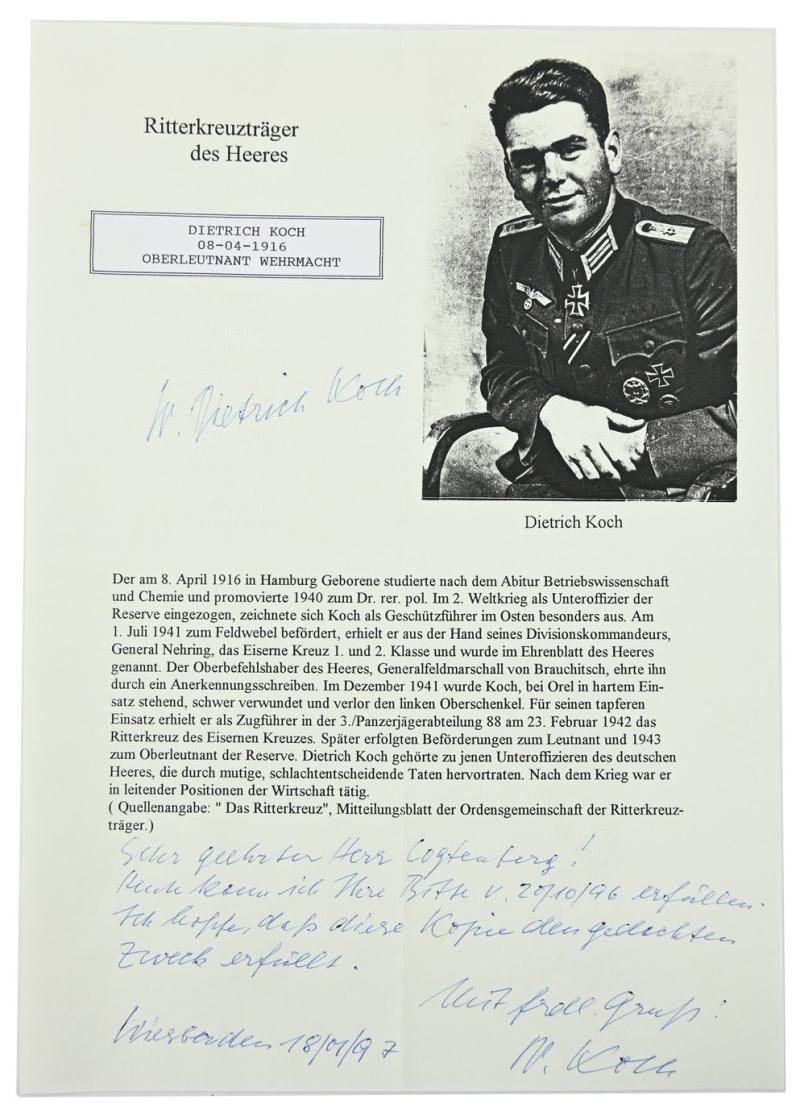 In a very nice condition a original signature on a letter of Dietrich Koch.Oberleutnant Dietrich Koch earned the knight's cross of the Iron Cross on February 23, 1942 as Feldwebel und Zugführer in the 3. Kompanie/ Panzerjäger-Abteilung 88 of the 18. Panzer-Division.