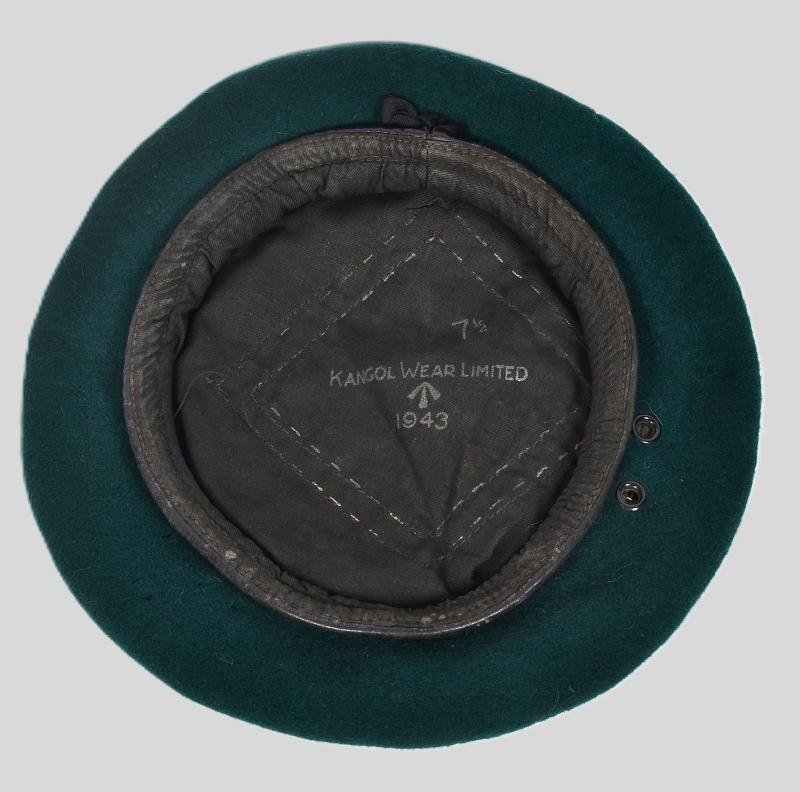 A textbook example of the famous and very hard won green Commando beret . This 1943 dated example made by the prolific maker Kangol Wear shows light service wear and is thus perfect for display . All the characteristics of manufacture are very visible including N over WD stamp correct machine and hand applied stitching , silk draw cord , eyelets and leather backing patch . The crown 'hood' is of the correct wool weave and shows good deep colour with just some light scattered moth tracking etc. All maker markings and date are still highly visable .