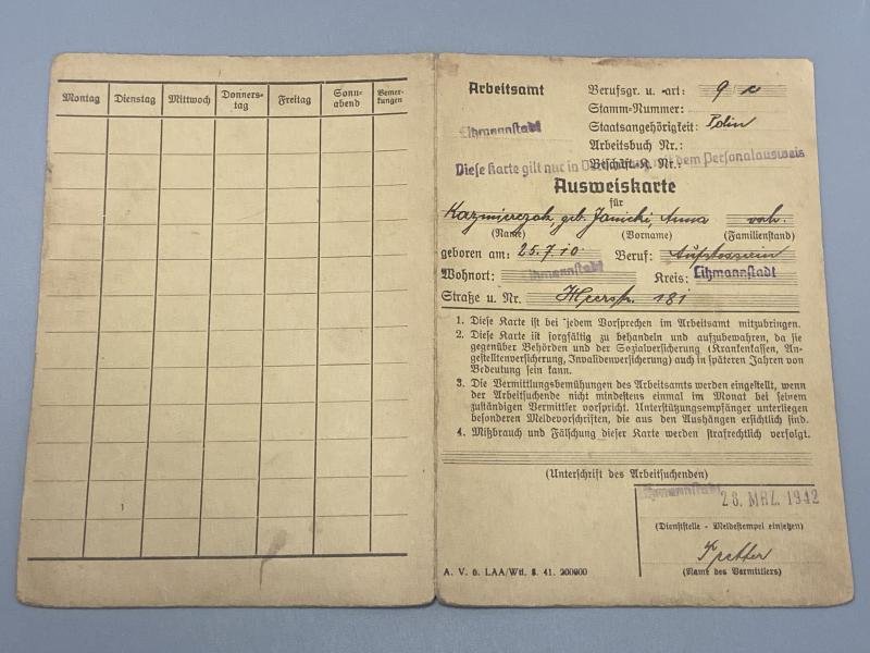 WW2 Polish Workers Card 1942 Litzmannstadt Nazi Occupation