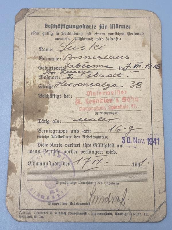 WW2 Polish Jewish Workers Card Litzmannstadt Dated 1941 Nazi Occupation