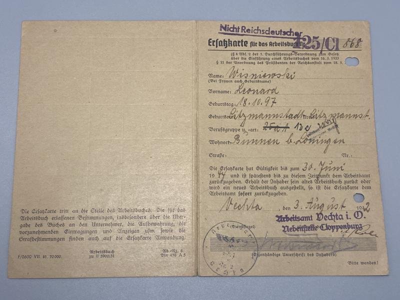 Original WW2 Polish workers card to Leonard Wismiewski who was shipped into Germany to work at Hugo Vogelsang. A saw mill and lumberyard based in the Rhineland. Dated from 1940 until March 1945.