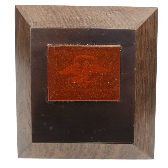 State Award for Breeding Achievements in Cattle Breeding (Staatsehrenpreis für Züchterische Leistungen in der Rindviehzucht). The large piece of amber is showing (when hold up against the light) an image of the Prussian Eagle between the script 'Staatsehrenpreis' and the script 'für Züchterische Leistungen in der Rindviehzucht'. The amber is mounted on a wooden base measuring approximately 10,5 x 9,5 cms. A small siver manufacturer tag is placed on the reverse indicating production by the Amber Manufactory in Königsberg im Preußen. Rare and decorative original item!