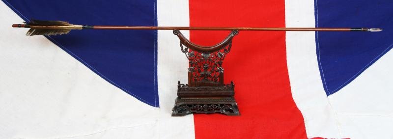 It is most rare to find original, antique samurai war arrows {ya} that still have beautifully polished tamagahane steel blades, that they would all have had originally, that often show the traditional hamon, the same as a traditional samurai sword would have had.Acquired by us by personally being permitted to select from the private collection one of the world's greatest, highly respected and renown archery, bow and arrow experts. Who had spent his life travelling the world to lecture on archery and to accumulate the finest arrows and bows he could find. .With original traditional eagle feathers, probably the large edge-wing feathers of a Japanese sea eagle. The armour piercing arrow tip, that is swollen at the tip to have the extra piercing power to penetrate armour and helmets {kabuto}, is a brightly polished, traditional tamagahane steel hand made, by a sword smith, long arrow head, originally hand made with folding and tempering exactly as would be a samurai sword blade, possibly signed on the tang under the binding but we would never remove it to see. The Edo period early eagle feathers are now slightly worn. It is entirely indicative of the Japanese principle that as much time skill and effort be used to create a single 'fire and forget' arrow, as would be used to make a tanto or katana. A British or European blacksmith might once have made ten or twenty arrows a day, a Japanese craftsman might take a week to make a single arrow, that has a useable combat life of maybe two minutes, the same as a simplest British long bow arrow.The Togari-Ya or pointed arrowheads look like a small Yari (spear) were pointed arrowheads were used only for war and are armour piercing arrows . Despite being somewhat of a weapon that was 'fire and forget' it was created regardless of cost and time, like no other arrow ever was outside of Japan. For example, to create the arrow head alone, in the very same traditional way today, using tamahagane steel, folding and forging, water quench tempering, then followed by polishing, it would likely cost way in excess of a thousand pounds, that is if you could find a Japanese master sword smith today who would make one for you. Then would would need hafting, binding, and feathering, by a completely separate artisan, and finally, using eagle feathers as flights, would be very likely impossible. This is a simple example of how incredible value finest samurai weaponry can be, items that can be acquired from us that would cost many times the price of our original antiques in order to recreate today. Kyu Jutsu is the art of Japanese archery.The beginning of archery in Japan is pre-historical. The first images picturing the distinct Japanese asymmetrical longbow are from the Yayoi period (c. 500 BC – 300 AD).The changing of society and the military class (samurai) taking power at the end of the first millennium created a requirement for education in archery. This led to the birth of the first kyujutsu ryūha (style), the Henmi-ryū, founded by Henmi Kiyomitsu in the 12th century. The Takeda-ryū and the mounted archery school Ogasawara-ryū were later founded by his descendants. The need for archers grew dramatically during the Genpei War (1180–1185) and as a result the founder of the Ogasawara-ryū (Ogasawara Nagakiyo), began teaching yabusame (mounted archery) In the twelfth and thirteenth century a bow was the primary weapon of a warrior on the battlefield. Bow on the battlefield stopped dominating only after the appearance of firearm.The beginning of archery in Japan is pre-historical. The first images picturing the distinct Japanese asymmetrical longbow are from the Yayoi period (c. 500 BC – 300 AD).The changing of society and the military class (samurai) taking power at the end of the first millennium created a requirement for education in archery. This led to the birth of the first kyujutsu ryūha (style), the Henmi-ryū, founded by Henmi Kiyomitsu in the 12th century. The Takeda-ryū and the mounted archery school Ogasawara-ryū were later founded by his descendants. The need for archers grew dramatically during the Genpei War (1180–1185) and as a result the founder of the Ogasawara-ryū (Ogasawara Nagakiyo), began teaching yabusame (mounted archery) Warriors practiced several types of archery, according to changes in weaponry and the role of the military in different periods. Mounted archery, also known as military archery, was the most prized of warrior skills and was practiced consistently by professional soldiers from the outset in Japan. Different procedures were followed that distinguished archery intended as warrior training from contests or religious practices in which form and formality were of primary importance. Civil archery entailed shooting from a standing position, and emphasis was placed upon form rather than meeting a target accurately. By far the most common type of archery in Japan, civil or civilian archery contests did not provide sufficient preparation for battle, and remained largely ceremonial. By contrast, military training entailed mounted maneuvers in which infantry troops with bow and arrow supported equestrian archers.Mock battles were staged, sometimes as a show of force to dissuade enemy forces from attacking. While early medieval warfare often began with a formalized archery contest between commanders, deployment of firearms and the constant warfare of the 15th and 16th centuries ultimately led to the decline of archery in battle. In the Edo period archery was considered an art, and members of the warrior classes participated in archery contests that venerated this technique as the most favoured weapon of the samurai. In the gallery is from an Edo exhibition of archery that shows a tagari ya arrow pierced completely through, back and front, an armoured steel multi plate kabuto helmet. Another photo shows an unmounted arrow head with the considerable length of the tang that is concealed by the haft.In the gallery is from an E