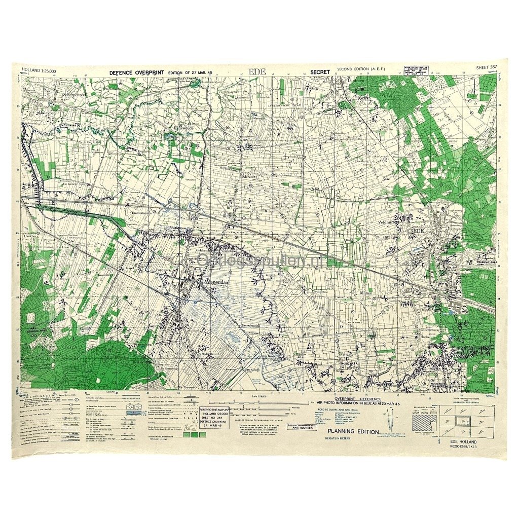 This secret Allied map is in good condition, and was used on March 27, 1945.The map shows German troops in the vicinity of Ede.It is an 'overprint' with all kinds of positions of German troops showing troop movements and all kinds of enemy positions.This map shows places such as Ede, Renswoude, Veenendaal, Lunteren, Bennekom and Veldhuizen.Map dimensions: 62 x 50 cm.March 1945 was a dark, tense month for Ede.While liberation seemed imminent, violence actually flared up.Resistance groups in and around Ede carried out desperate actions, including secret arms drops near the Ginkel Heath.On March 23, a fatal drop took place near the Keuenklep, where German troops were waiting for the resistance group.Sixteen resistance fighters were arrested and later executed in Camp Amersfoort.The inhabitants of Ede lived in fear and uncertainty.Tension hung tangibly in the air: the Germans were slowly withdrawing, but remained dangerous.Homes were searched, resistance fighters betrayed, and food became scarcer than ever.Still, hope for liberation continued to grow.Only a few weeks later, on April 17, 1945, Ede was actually liberated by Canadian troops.During the capture of the enemy, several Dutch SS were also captured who served in the SS Landstorm Nederland division.Staff maps still regularly appear on the market, but those showing enemy positions and detailed battle plans are extremely rare and hard to find!A beautiful and historic map, perfect for framing and displaying on the wall in a collection room!Article number: 15981Originele WWII Geallieerde geheime kaart van Ede β maart 1945Deze geheime Geallieerde kaart is in goede conditie, en werd gebruikt op 27 maart 1945.De kaart laat de Duitse troepen in de omgeving van Ede zien.Het betreft een 'overprint' met allerlei posities van Duitse troepen met daarop troepenbewegingen en allerlei vijandelijke stellingen.Op deze kaart zijn plaatsen zoals Ede, Renswoude, Veenendaal, Lunteren, Bennekom en Veldhuizen op te zien.Afmetingen kaart: 62 x 50 cm.Maart 1945 was een donkere, gespannen maand voor Ede.Terwijl de bevrijding nabij leek, laaide het geweld juist op.Verzetsgroepen in en rond Ede voerden wanhopige acties uit, waaronder geheime wapendroppings bij de Ginkelse Heide.Op 23 maart vond een fatale dropping plaats bij de Keuenklep, waar Duitse troepen op de verzetsgroep wachtten.Zestien verzetsstrijders werden gearresteerd en later geΓ«xecuteerd in kamp Amersfoort.De inwoners van Ede leefden in angst en onzekerheid.De spanning hing voelbaar in de lucht: de Duitsers trokken zich langzaam terug, maar bleven gevaarlijk.Huizen werden doorzocht, verzetsmensen verraden, en voedsel werd schaarser dan ooit.Toch bleef de hoop op bevrijding groeien.Slechts enkele weken later, op 17 april 1945, werd Ede daadwerkelijk bevrijd door Canadese troepen.Bij de gevangenneming van de vijand werden er ook diverse Nederlandse SS'ers gevangen genomen welke diende in de SS Landstorm Nederland divisie.Stafkaarten komen nog regelmatig op de markt, maar stafkaarten met daarop de vijandelijke posities en gevechtsplannen zijn zeer zeldzaam en lastig te vinden!Een prachtige en historische kaart om wellicht in te lijsten aan de muur in een collectie ruimte!