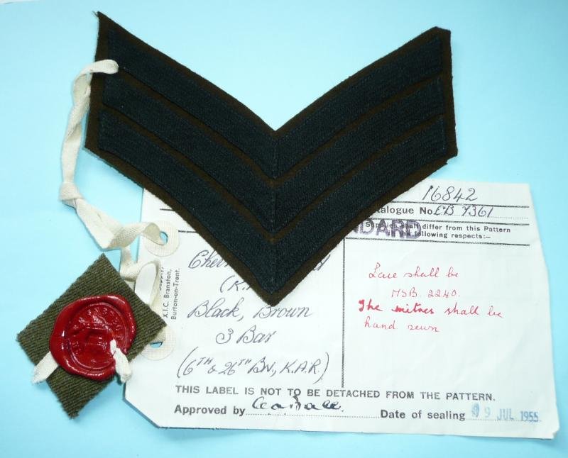 Scarce embroidered in black on brown sergeant's rank chevrons still affixed to a canvas 'Working Pattern' card dated July 1955 complete with red wax seal. Card states, 'Chevrons Worsted (6th.& 26th. Bn. K.A.R.). Scarce.K93.3