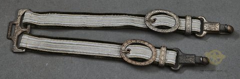 German WWII Deluxe Army Hangers-This is a nice set of army hangers. The clips have ornate buckles, fittings and snap clips. They have a detailed design of oak leaves on the clip and a leaf wreath motif on the buckles. Even the snap clips continue the leaf motif. I would say that the fittings retain approx. 80% of their original silver finish. They show only slight wear and have great details. The fabric straps are near excellent, with minimal toning. The green velvet on the reverse is completely intact and damage free. The top bracket, and the snap clips are all marked with D.R.G.M. This is a very nice set of hangers. This would look great on your dagger.