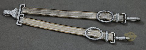 German WWII Super Deluxe Army Hangers-Wow! These are gorgeous. These have been stored or displayed correctly as they look awesome. This set of hangers has ornate clips, buckles, fittings and snap clips. They have a detailed motif of oak leaves on the clip and a leaf wreath design on the buckles. The snap clips are pebbled, but do not have the leaf motif. The metal fittings retain the majority of their original silver finish. They show only slight wear and have great details. The fabric straps are in very good condition with only minimal toning. The dark green velvet on the reverse is damage free and 100% in place. This is a very good-looking set of hangers.