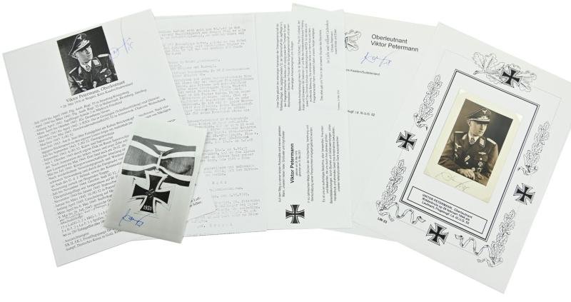 In a very good condition a postwar portrait photo with original signature of Luftwaffe Ace Victor PetermannLeutnant Victor Petermann earned the Knight's Cross of the Iron Cross on 29 February 1944 as a Pilot in the III./Jagdgeschwader 52.He was credited with 64 kills in 550 missions. In addition he recorded six unconfirmed victories. All his victories were recorded over the Eastern front.The picture comes with his wartime achivement record and an extra signature of Viktor.
