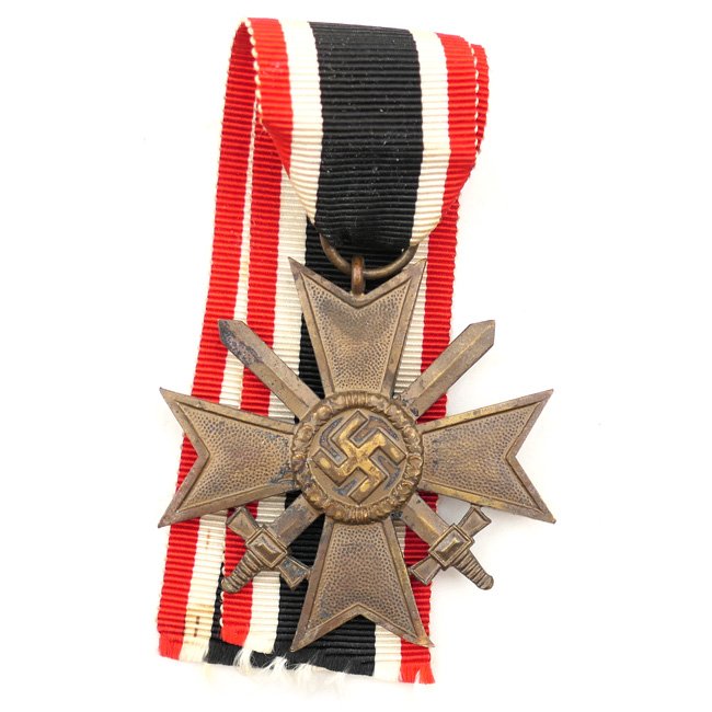 War Merit Cross 2nd Class with Swords (Kriegsverdienst Kreuz 2. Klasse mit Schwerter). The War Merit Cross was instituted by Adolf Hitler on 18 October 1939. The cross is a nice tombak example and comes with its original smaller type ribbon as found. The cross is not visible maker marked. Nice original cross in good used condition!