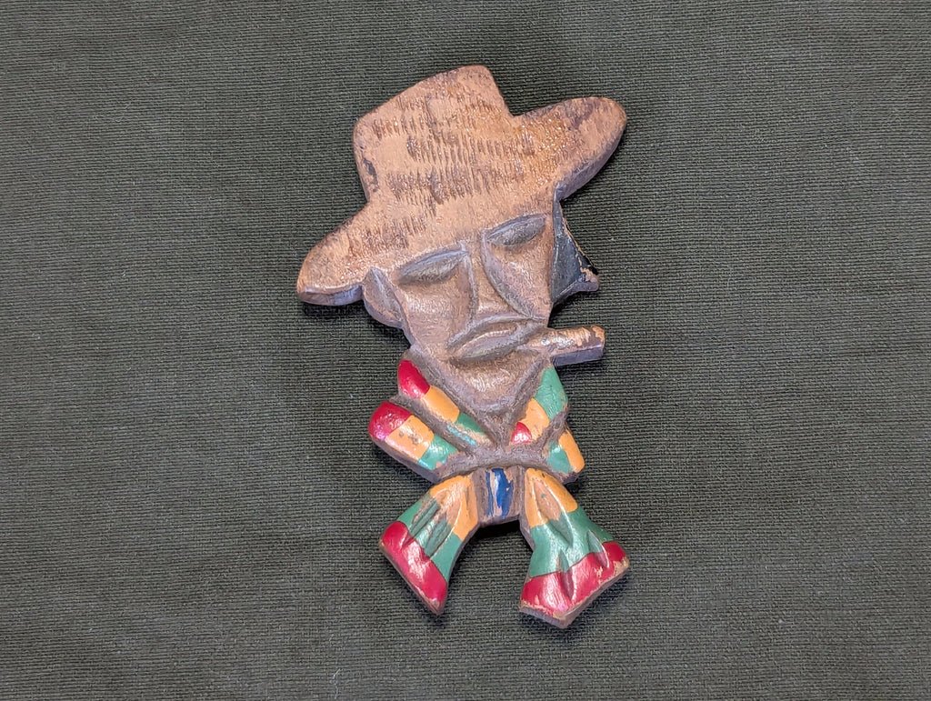 Vintage 1940s wooden cowboy novelty pin. Nice larger size. The paint on the scarf his some chips. Otherwise fairly good condition.