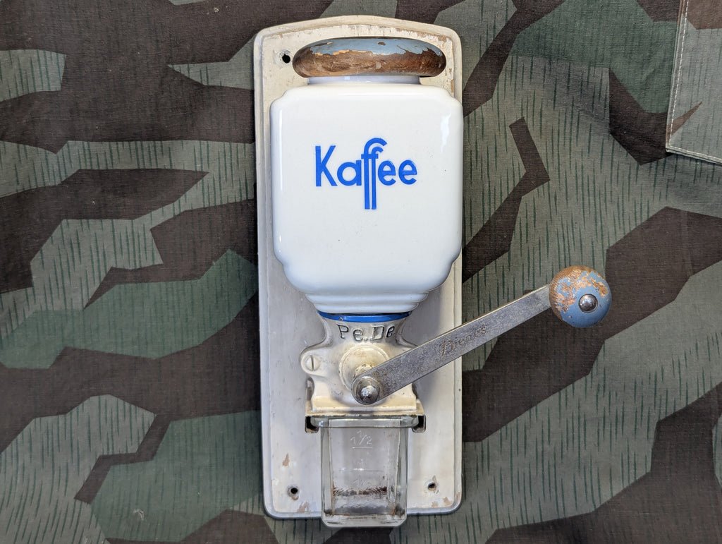 Nice vintage German kitchen wall mounted kaffeemühle coffee grinder in usable condition. There is some wear to the painted parts. Made by Pe De. It probably should get a bit of a cleaning, but it is in generally rather good condition. The rubber gasket material is missing from the lid, so it only loosely sits on top. This doesn't effect its function and isn't really all that noticeable in general. The wood cap is the original one to this grinder, but the paint has largely chipped off. Overall this is a very nice example which is not overly ornate, it derives its beauty from its form without excessive decoration which I often find on these. If I didn't already have a similar one in my kitchen, I would probably be keeping this one.