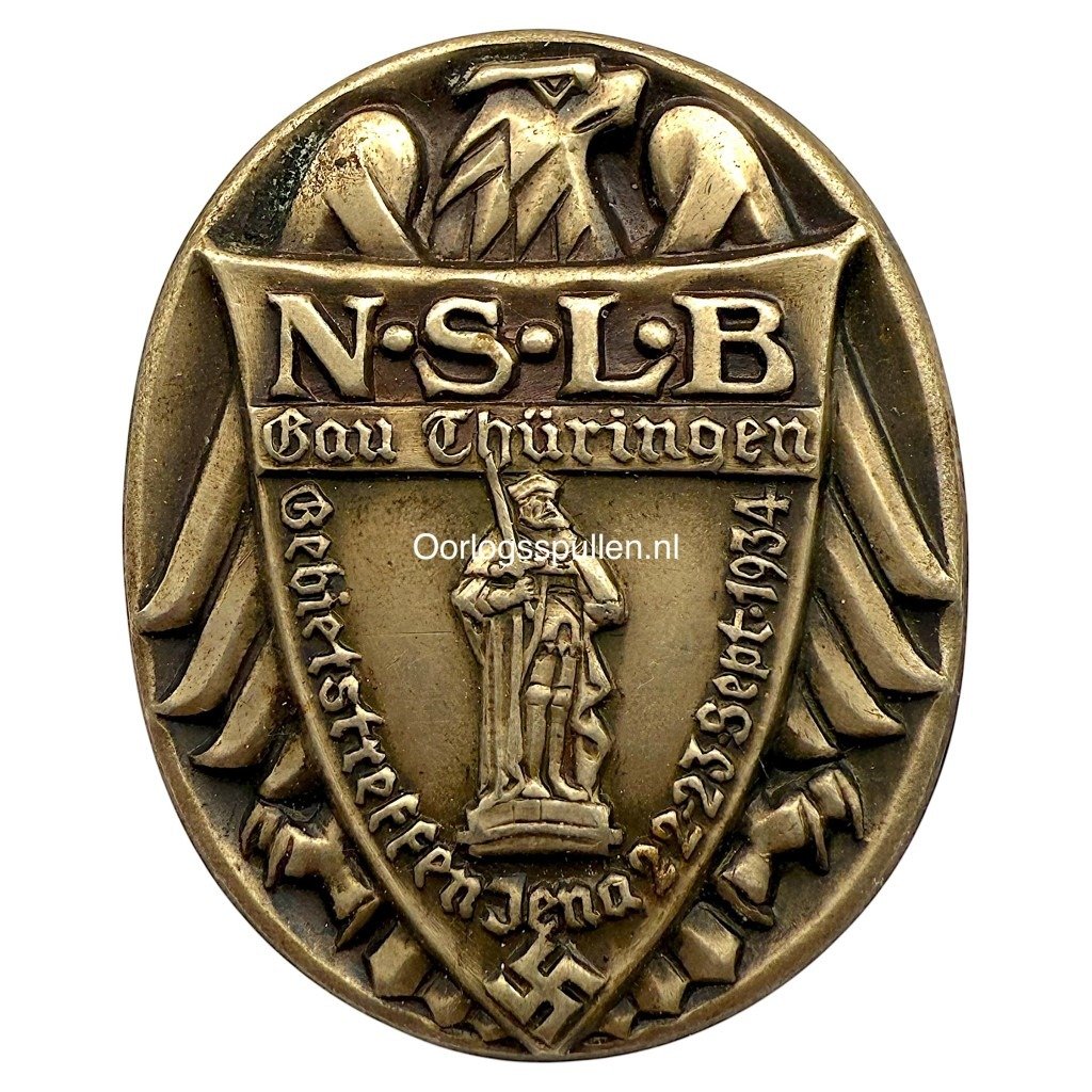 This German NSLB pin is in good condition, dates from Sept. 22-23, 1934, and was issued at a meeting in Jena in Gau Thuringia of the Nationalsozialistischer Lehrerbund (NSLB), also known as the National Socialist Teachers' Association.The pin is complete with functional pin on the reverse.Article number: 16013Originele WWII Duitse NSLB lerarenbond speld Jena Thüringen 1934Deze Duitse NSLB speld is in goede conditie, dateert van 22-23 september 1934 en werd uitgegeven bij een bijeenkomst in Jena in Gau Thüringen van de Nationalsozialistischer Lehrerbund (NSLB), ook wel bekend als de Nationaalsocialistische Lerarenbond.De speld is compleet met functionele speld aan de achterzijde.