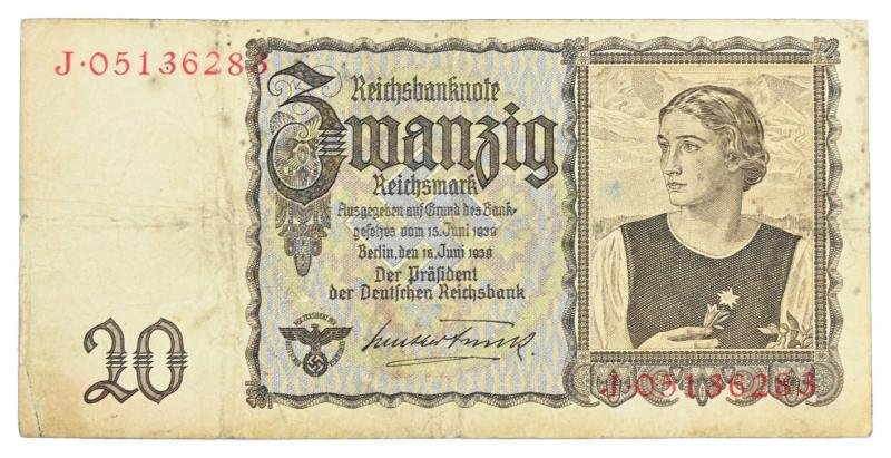 German Third Reich period BanknoteIn a very good condition a German Third Reich period Banknote.The banknote comes with a value of 20 Reichsmark.