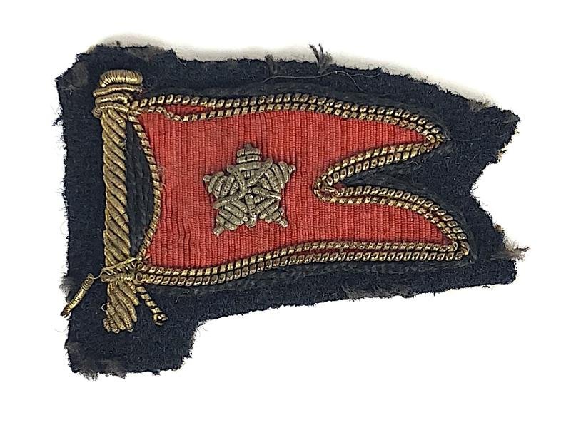 An extremely rare original circa 1920's 'White Star Line uniform badge', gold bullion lined red ribbed pennant with two tails charged with silver bullion five-pointed star, set on black felt backing; the reverse with hessian waxed cotton lining. Good condition, some minor service wear, the edge with traces of thread.Size approx 49 x 35mm.