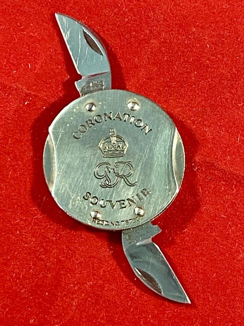 Here on offer is a double bladed 'coin' penknife by G. Ibberson of Sheffield. It has been made as a souvenir of the coronation of King George VI on 12th May 1937.The knife when closed just looks like a 'Coin' as both blades are well concealed.On one side it depicts the royal cypher for George VI with the words:CORONATIONSOUVENIRThere is also an REGD. NO. 787232 for the year 1933/34.On the other side it shows the crowned profiles of the King ad Queen along with the words:GEORGE VI AND ELIZABETHMAY 12th 1937Both of the small stainless steel knives are razor sharp and still retain a strong spring action, when opened and closed.One knife is stamped on one side with the maker's name:G. IBBERSON & Co and the 'Violin' logo.Then of the other side with:FIRTH STAINLESSFIRTH stainless steel was regarded as one of the best made at that time and G. Ibberson used it to make their knife blades.The other blade is also stamped on one side with the maker's name:G. IBBERSON & Co and the 'Violin' logo.Then of the other side with:MADE INSHEFFIELDENGLANDThe blades are still razor sharp and just show some light scratch marks.This rare commemorative stainless steel 'Coin' knife is in excellent condition and looks to have never been used.Each blade measures 0.75' (1.8cm) long and when closed the 'Coin' measures 1.25' (3.2cm) diameter.It weighs 22g.Please see my pictures for the details of the condition, which complement this description.Please see my TERMS OF BUSINESS regarding Deliver Charges and Insurance regarding additional insurance cover, should you require it, BEFORE the item is dispatched.The responsibility lies with the customer to check with your Customs restrictions that this item can be imported into your country.