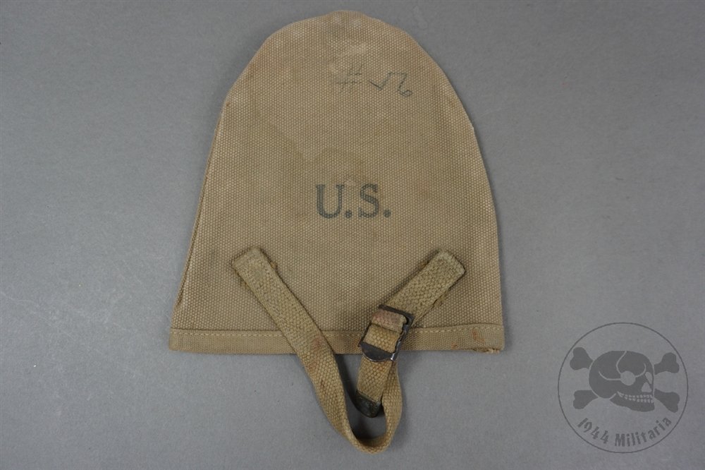 Original US WWII M1910 T-Handle Shovel Carrier--Dated 1942This authentic M1910 canvas shovel cover was designed to carry the U.S. Model 1910 entrenching tool, a T-handle shovel widely used during both World War I and World War II.The carrier shows some staining on both sides consistent with age and use. The hardware is slightly rusted, too. One side is marked 'U.S.,' while the reverse bears the manufacturer's stamp: 'Berkeley Bags, Inc. 1942.' A solid example of an original WWII-issued field gear item.