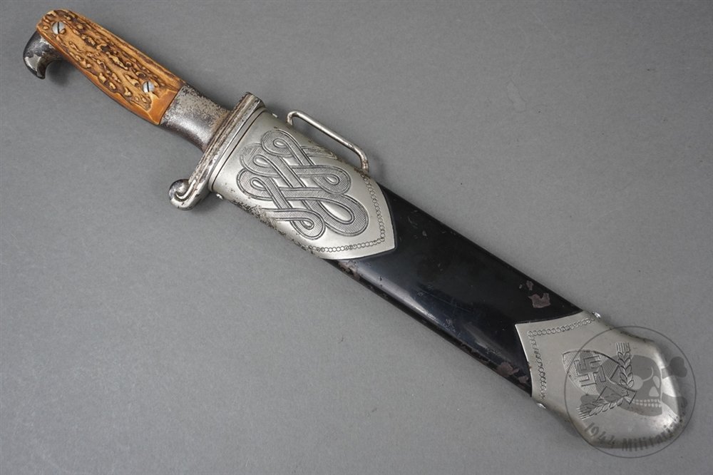 Original Third Reich RAD Hewer By Carl Jul. Krebs-This is an authentic RAD (Reichsarbeitsdienst) enlisted man's hewer, manufactured by Carl Jul. Krebs of Solingen, showcasing the heavy and bold design typical of early Third Reich craftsmanship. These hewers were worn by enlisted personnel of the German Labor Service and remain highly sought after by edged weapon collectors.Hilt:The nickel-plated hilt shows honest age and handling wear, with areas of plating loss consistent with field or dress use. Despite the wear, the crossguard retains sharp details, particularly around the stylized RAD spade and ornamentation, adding to its character and authenticity.Grip:The stag horn grip plates are in excellent condition, showing deep texture and natural coloration. Both grips remain tightly secured to the hilt with no cracks, chips, or looseness, often a concern with these robustly constructed pieces.Blade:The heavy, full-length blade remains bright and retains a clear etching of the RAD motto: 'Arbeit adelt' ('Labor ennobles') on the obverse.The reverse features the Carl Jul. Krebs Solingen maker mark, along with the RAD triangle logo and 'Ges. Gesch.' (legally trademarked). While showing some minor use and light age-related graying, the blade is in very good condition overall, with crisp edges and no major flaws.Scabbard:The steel scabbard body remains straight and retains much of its original black painted finish, showing only minor wear and aging typical of period use. Both scabbard fittings are intact and in good condition, with no dents or damage. All screws remain present and undisturbed.This is a solid and collectible example of a RAD enlisted man's dress hewer, complete and unaltered, with great maker markings and original finish. A rugged and iconic design, it remains a must-have for any serious WWII edged weapon or Third Reich collection.