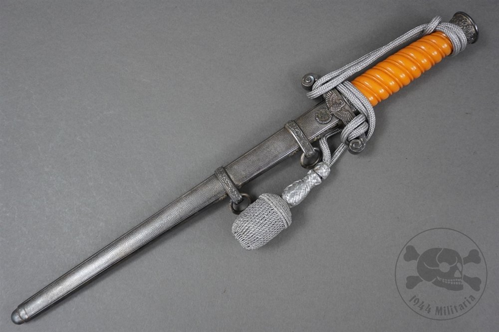 Original German WWII Heer Officer's Dagger By Carl EickhornWith Portopee-This is an original German WWII Army (Heer) officer's dagger, manufactured by Carl Eickhorn, one of the most respected and sought-after Solingen blade makers of the period. The dagger features classic mid-war fittings with a silvered finish and comes complete with its original portopee.Fittings & Grip:The crossguard features the distinctive Wehrmacht eagle clutching a swastika, showing fine detail with only minor age toning. The deep orange celluloid grip remains in excellent condition, free from cracks or chips, and shows only minimal age-related wear. Both the pommel and ferrule retain sharp detailing and a lightly aged patina, consistent with wartime manufacture.Blade:The blade is in excellent condition, showing minimal wear and comes to a nice point. It retains much of its original bright finish with light gray spotting and faint runner marks typical of normal draw wear. The reverse of the blade is etched with the Carl Eickhorn seated squirrel logo, positioned near the ricasso. The edges are clean and the blade remains tight to the hilt.Scabbard:The scabbard retains its original silvered finish with finely detailed pebbling on both sides. There is some light tarnishing throughout, giving it a uniform, aged appearance. The silvering appears to have dulled slightly with time, though the surface still presents well. The scabbard throat screw remains intact and undisturbed, and the scabbard itself is straight and structurally sound.Portepee:The included original portopee is in excellent condition, showing only minimal age toning and minor staining. The bullion wire remains bright and tightly woven, with the knot properly tied around the guard in regulation fashion. It has clearly been well-preserved over the years.This is a well-preserved example of a German WWII Heer officer's dagger by Carl Eickhorn, complete with original portopee. With its clean blade, desirable maker mark, detailed fittings, and vibrant grip, this piece offers both historical value and strong display appealβa fine addition to any collection of Third Reich edged weapons.