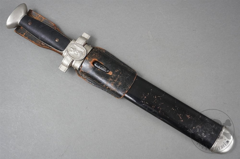 Original Third Reich Red Cross (Deutsches Rotes Kreuz, DRK) Hewer with Frog-In 1938, the Deutsches Rotes Kreuz (German Red Cross) was formally recognized as an official organization of the Nazi Party, and with that designation came the introduction of a distinctive edged weapon: the 'Hauer für Mannschaften', the Red Cross Hewer for enlisted personnel. Unlike traditional dress daggers, this utilitarian blade featured a blunt tip, a single cutting edge, and a sawback spine, designed not only for ceremonial use but also for practical field tasks such as preparing splints, bandages, and casts. Issued from unit stock as needed, these weapons were not privately purchased, making them a unique item among German edged weapons of the era.This is an authentic and well-preserved example, complete with its original scabbard and leather frog, and remains in very good to excellent condition overall.Hilt:The nickel-plated hilt retains a strong finish with light age toning. The crossguard features a sharply detailed Red Cross medallion, which remains clean with minimal wear and clear definition.Grip:The grip plates are constructed of black synthetic material, with checkered fronts and smooth backs, both of which are in excellent condition. They remain tightly fitted and free from cracks or damage.Blade:The heavy, sawback blade remains bright and clean, with well-defined and sharp saw teeth. The blade's fuller and original crossgrain are still visible, indicating minimal use. It is correctly marked 'Ges. Geschützt', meaning 'Protected by Law.' The leather blade buffer is also present and intact. Overall, the blade is in excellent condition.Scabbard:The steel scabbard retains most of its original black painted finish, with some light handling marks and surface wear consistent with age. It remains straight and undented, with all fittings secure.Frog:The original black leather frog shows some dryness from age but remains fully intact with solid stitching and rivets. A light application of leather conditioner could help preserve its condition without compromising authenticity.This is a solid and complete example of the DRK Enlisted Man's Hewer, paired with its original scabbard and frog. With its excellent blade, tight grip, and iconic sawback profile, this piece is both visually striking and historically significant—a perfect addition for any serious WWII or edged weapon collection.