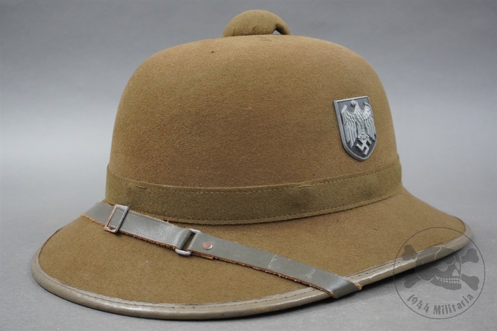 Unissued Original 2nd Pattern Tropical Heer Brown Felt Pith Helmet Size 57-This is an unissued, original German WWII 2nd Pattern Tropical Heer Pith Helmet, most commonly associated with the Afrika Korps and designed for use in the intense heat and sun of the North African campaign.Constructed from olive brown felt with matching trim, this helmet remains in exceptional, mint condition. It features a strong olive green leather chinstrap and an interior leather liner band clearly marked with the manufacturer logo 'JHS,' size '57,' and dated 1942.There is minor mothing on the felt band on one side and a small moth nip on the top of the dome, but overall, the helmet presents beautifully. It is adorned with the correct zinc/aluminum Heer eagle shield on the left and a Tri-color national shield on the right—both firmly affixed and retaining excellent detail.A rare, well-preserved example of a tropical pith helmet, perfect for any advanced WWII collection.