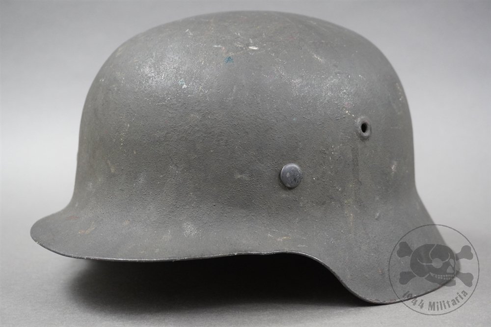 Original German WWII Heer/Waffen SS No Decal M42 Helmet EF68-This M42 helmet is an authentic World War II German combat helmet, retaining an impressive 98% of its original dark field gray paint on the exterior with most of the interior as well, but there is some minor rust on the rear part of the rim. While there are minor scratches and some paint loss on the split pins, these imperfections do not detract from the helmet's overall well-preserved appearance.The original leather liner is fully intact, supple, and in excellent condition, complete with its original drawstring. The liner is marked size '60,' confirming its authenticity. Very faint but legible markings on the interior rim indicate the shell was produced by Emaillierwerk Fulda (EF), in size 68, with a slightly visible lot number.The chinstrap is no longer present.Overall, this is a well-preserved and highly desirable M42 no-decal combat helmet—ideal for collectors and historians with an interest in original Heer or Waffen-SS field gear from the Second World War. Its originality, condition, and markings make it a valuable piece of wartime history.