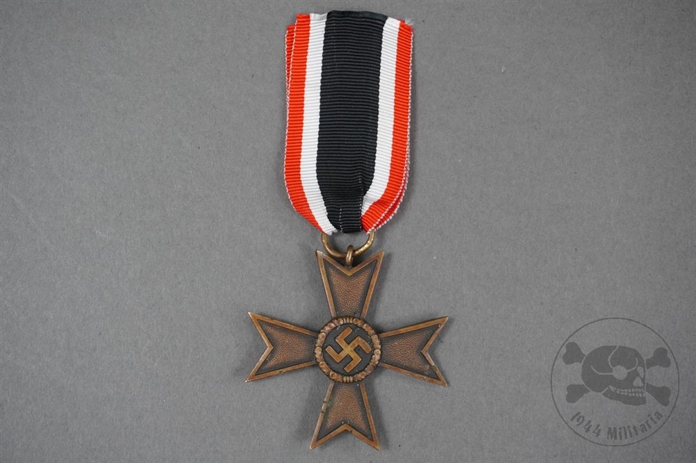 Original German WWII War Merit Cross Without Swords Second Class With Ribbon Unmarked-This original War Merit Cross 2nd Class Without Swords was instituted by Adolf Hitler in 1939 as a successor to the non-combatant Iron Cross from earlier conflicts. It was awarded to civilians for outstanding service in support of the war effort, while the versionwith swordswas presented to military personnel for exceptional service not directly involving combat. Notably, recipients were typically awarded the versionwithout swordsbefore becoming eligible for thewith swordsvariant.This is an original example of the War Merit Cross 2nd Class without Swords. The cross exhibits a nice, even patina and wear consistent with age. It is not maker-marked on the ribbon ring. The original ribbon is in excellent condition.