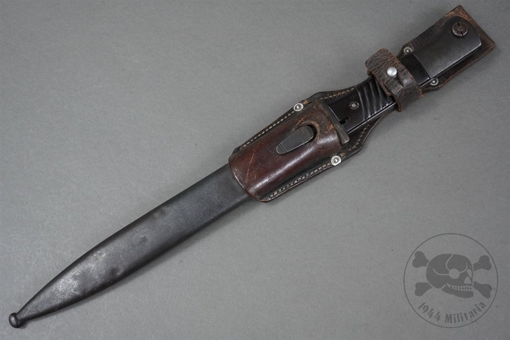 Original German WWII Non-Matching k98 Bayonet By P. Weyersberg With 1939 FrogThis bayonet is in excellent overall condition, showcasing its original craftsmanship.Blade: Retains its original bluing with only light aging. Maker marked 'P.WEYERSBERG' one one side of the blade; and has the serial number '4663' on the other side.Grips: Bakelite grips are intact, free of cracks or damage. Minor wear.Locking Button: Fully functional and operates smoothly.Scabbard: Has some very small dents and shows light aging, remaining in very good condition.Included with the bayonet is a marked leather frog featuring aluminum fittings. The leather remains in excellent condition and complements the bayonet well. The frog was most likely issued from the factory as natural brown leather and then dyed black by the soldier. Most of the black dye has worn off, but giving it a nice worn look. It is clearly marked and dated 1939 on the back.This set, consisting of the bayonet, scabbard, and frog, is a prime example of a collectible WWII German K98 bayonet ensemble in excellent condition.