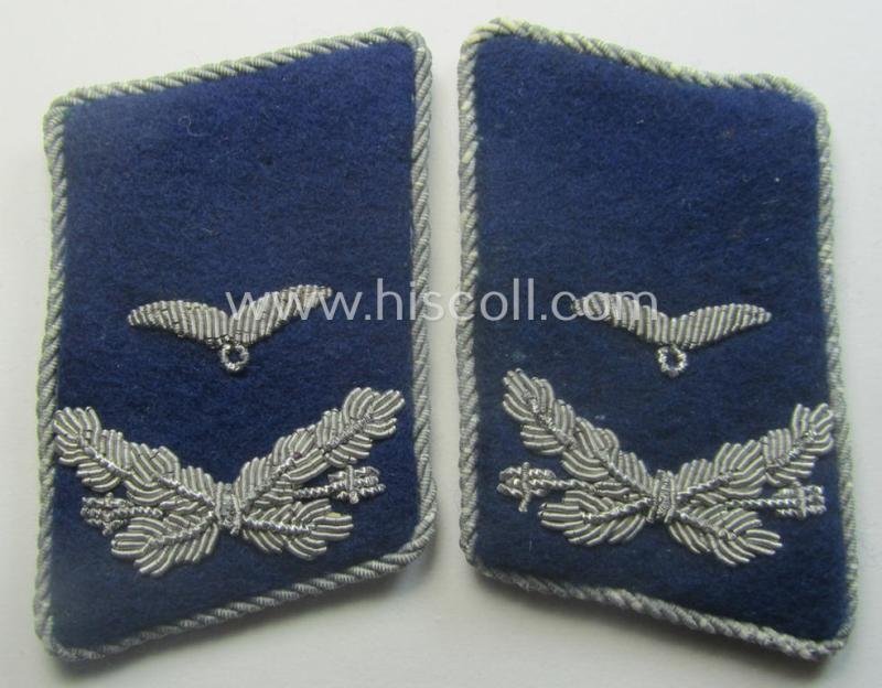 This is an attractive - and fully matching! - pair of WH (Luftwaffe) officers'-type collar-patches (ie. 'Kragenspiegel fĂŒr Offiziere der Luftwaffe') as was executed in the darker-blue- (ie. 'blauer'-) coloured and/or: typical smooth-type- ie. 'moleskin'-type wool, as was specifically intended for usage by a: 'Leutnant o. Arzt der der SanitĂ€ts-Truppen' (or: lieutnant and presumably medical doctor who served within the airforce medical-branch) and that comes in an overall very nice- (ie. I deem simply never used- ie. 'virtually mint'- and/or I deem never tunic-attached-), condition. The pair is neatly hand-embroidered and shows great detail and/or craftmenship. Both pieces have a 'standard-type', beige-brown-coloured- and/or 'buckram'-based backing attached as to be expected: both tabs were once glued into an album or scrapbook and do show some minimal glue- ie. paper-remains on their backs (as can be seen on the pictures). Simply a very attractive pair of LW officers'-type collar-tabs that will be very hard to be upgraded and that is I deem accordingly priced!