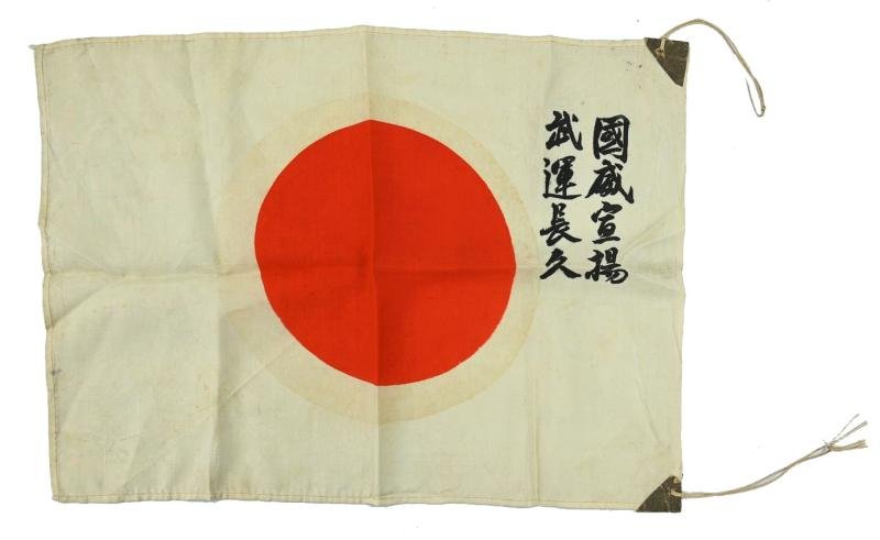 In a very good condition a Japanese Rifle flag.The rifle flag comes in a rising sun flag (or Hinomaru (日の丸).The flag comes in a small size 26x36cm and has the text written: '國威宣揚 武運長久' (Kokui Sen'yō Buun Chōkyū), what means 'Verheerlijk de nationale prestige; Moge de krijgskans voor altijd duren' / Keep our honor high/ may the battlechances remain for ever)A very stunning flag the japanese soldiers put on the front of the rifle for combat.Hard to find!