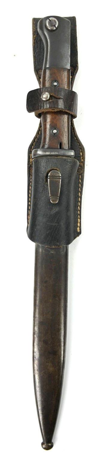 In a very good condition, near mint a stunning German Wehrmacht K98 Matching Bayonet with frog.The leather frog is nicely marked on the reverse side with RBN number 0/0805/0018 and comes with the original attached number matching bayonet made by Ernst Pack & Sohn from Solingen and with a production code 2938.Dated 1937!The bayonet and frog are WaA marked on the textbook locations and a overal great example!