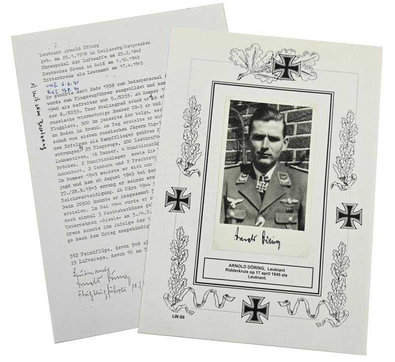 In a very good condition a original signature on a postwar picture of Arnold Döring.Leutnant Arnold Döring earned the German Cross in Gold on September 25, 1942 as Feldwebel in the 8. Staffel/ Kampfgeschwader 55 and the Knight's Cross of the Iron Cross on April 17, 1945 as Leutnant und Flugzeugführer of the 10. Staffel/ Nachtjagdgeschwader 3.