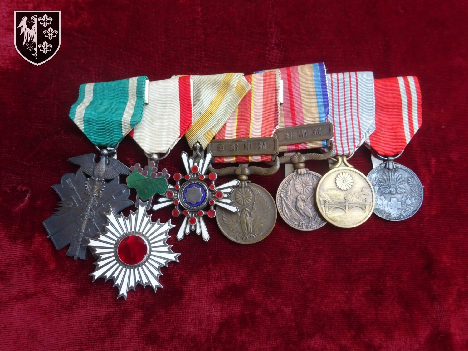 Barrette japonaise 7 médailles : Ordre du Milan d'or, médaille Ordre du Soleil Levant 6e classe, médaille Ordre du Trésor Sacré 6e classe, médaille Campagne du Mandchourie 1931-1934, médaille incident de Chine 1937, médaille 2600 ans de l'Empire japonais 1940, médaille membre de la croix rouge. Parfait état. Rare.