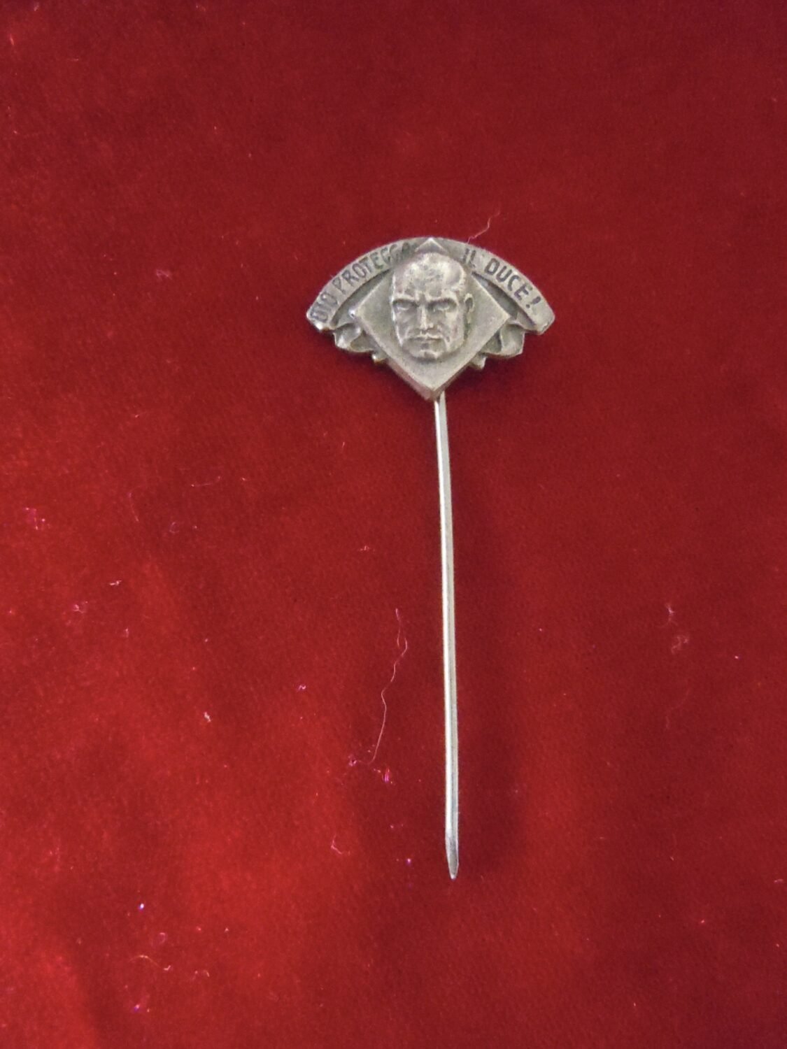 Épinglette Duce Bénito Mussolini. Marquage au dos du fabricant une bijouterie de Milan. Très bon état. Rare.