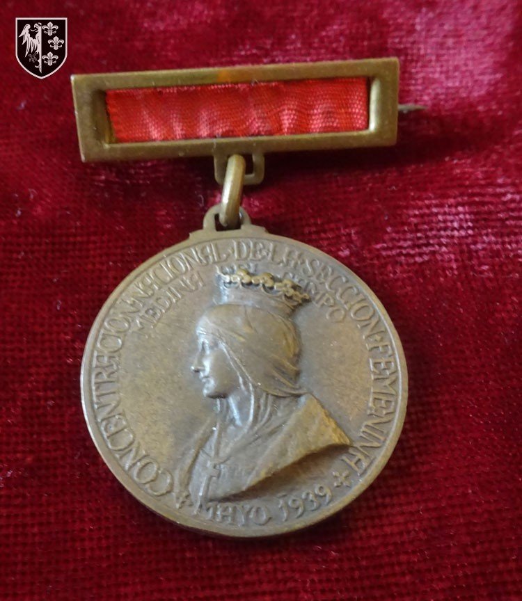 Médaille de la section féminine de la Phalange espagnole (1939) à l'effigie de la reine Isabelle la Catholique frappée en hommage à l'armée franquiste à l'issue de la guerre civile espagnole. TrÚs bon état.