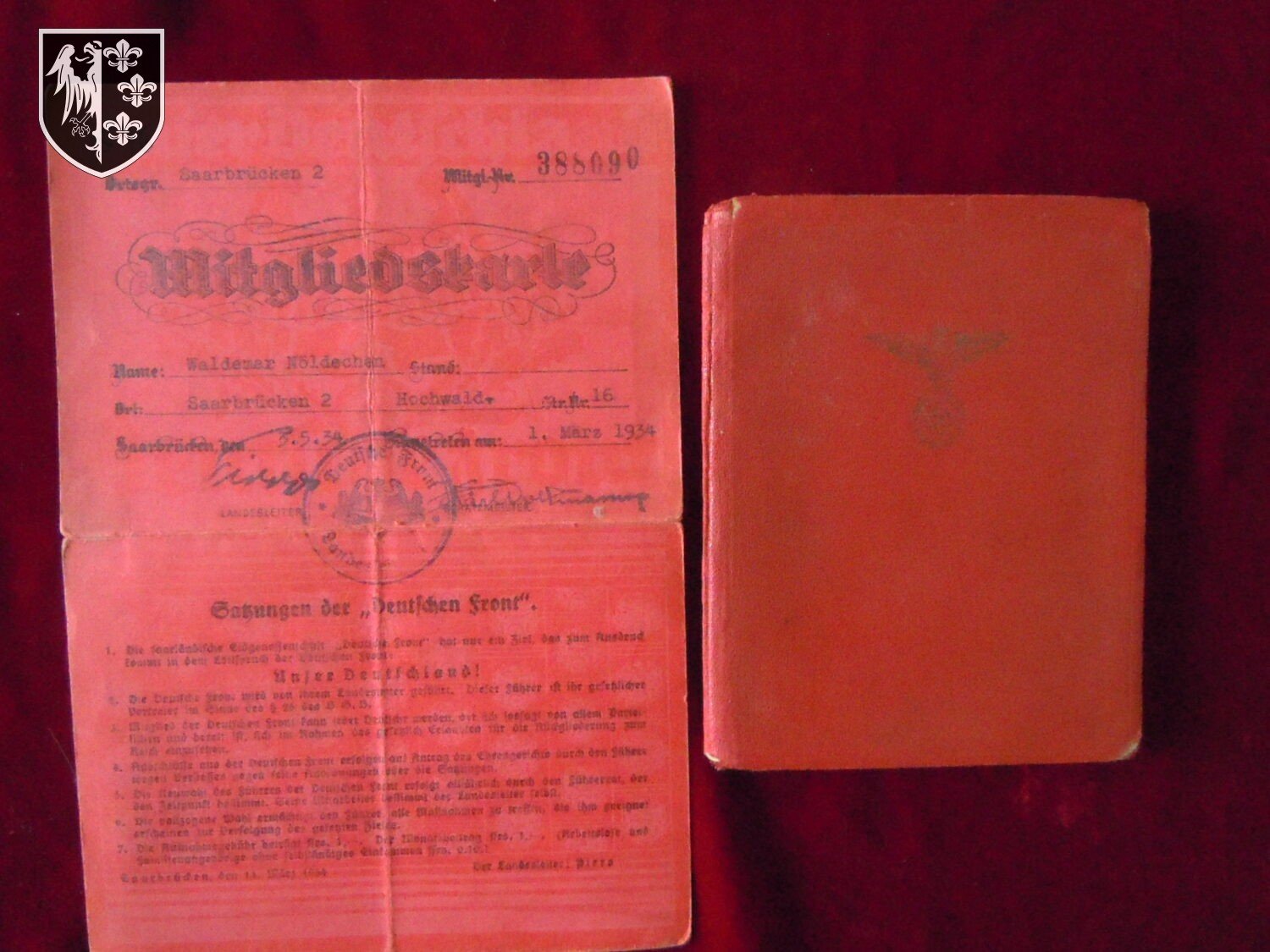 Livret d'adhérent au NSDAP au nom de Waldemer Noldeche. Il a rejoint le Parti en 1933. Son numéro d'adhérent est le 2681944. Il participe au congrÚs du NSDAP en 1937 et 1938. En 1941 il rejoint le Orstgruppe Jaslo en Pologne. Une carte Mitgliedskarte en date de 1934 accompagne le livret.
