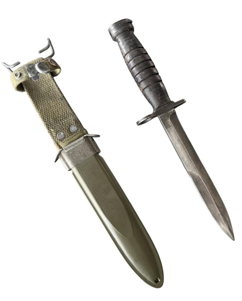 U.S. M4 Bayonet with M8 Scabbard, in nice used condition! The M4 bayonet was introduced in May 1944 and superseded the M3 Trench Knife. And also designed to fit the M1 Carbine as well as being a fighting knife. The knife is fitted with a nice used leather hand grip and clearly makers marked 'IUtical' on the hilt of the knife as well as the U.S. ordonance and 'U.S. M4' mark. With the knife comes an original M8 scabbard, clearly B.M. Co. makers marked. A nice original M4 bayonet with great patina.