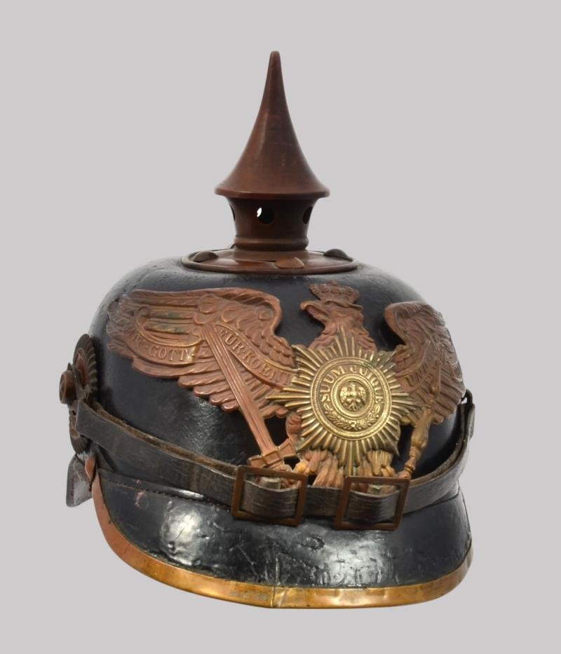 An interesting and long serving Pickelhaube being a pre war ,high quality issued helmet well marked to the 134R , this being a Saxon unit . The helmet has been depot reworked and fitted with The Guard Eagle/ Stern . This badge refitment clearly has been done officially, as a whole new set of badge dimension holes and brass eyelet and washers have been applied ( please see interior image ) This helmets format is correct for a Guard mans helmet however the (Dismounted) Lands Gendarmarie also wore this plate and exact format . The Lands Gendarmerie were formed from men with a minimum of at least 9 years Army service and would in wartime go from a reserve like status to that of Field Police ( Feldgendarmarie) who also wore this format in the dismounted role . The whole set has clearly been together for a very long time and all fittings are a deep red brown patinated tomback metal . Cockades and chin strap are untouched and original to the helmet . The leather lining is complete and supple and the helmets form is excellent .Yet another interesting and scare member of the pickelhaulbe family .