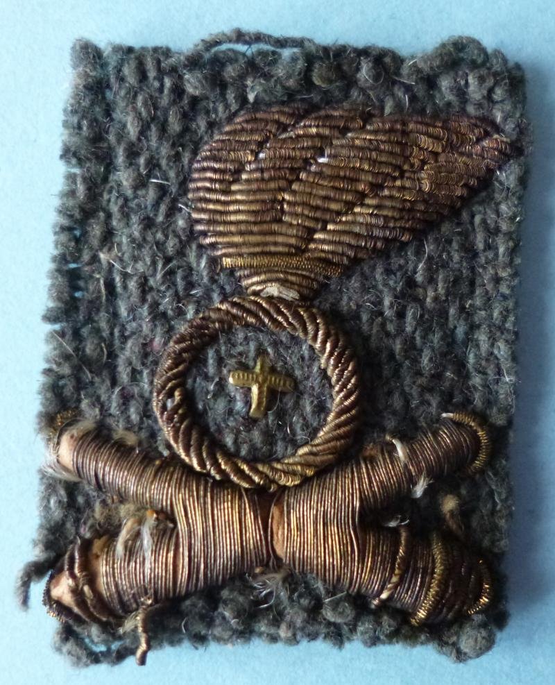Gold-wire hand-embroidered flaming grenade over crossed cannons on field-grey backing. The centre of the grenade has a tiny metal cross. The badge has been worn - uniform removed but remains in good condition.