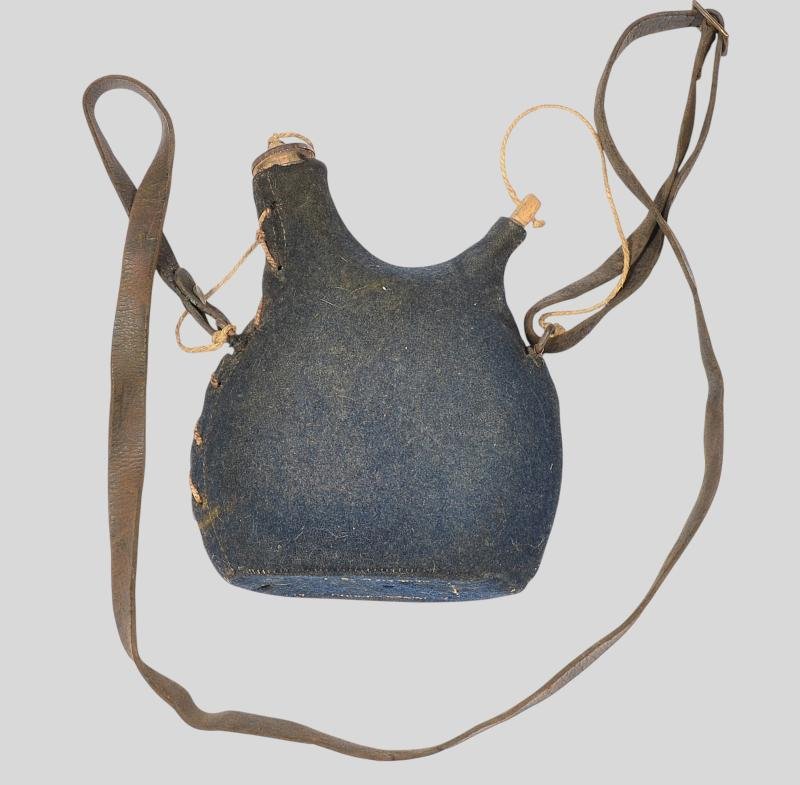 The typical 1 Litre M1877 bottle carried by all French dismounted troops during the early war August 1914 and on period .The dark steel blue wool fabric cover is well above average and has not been greatly mothed as with the vast majority . One small 1cm nick to fabric .