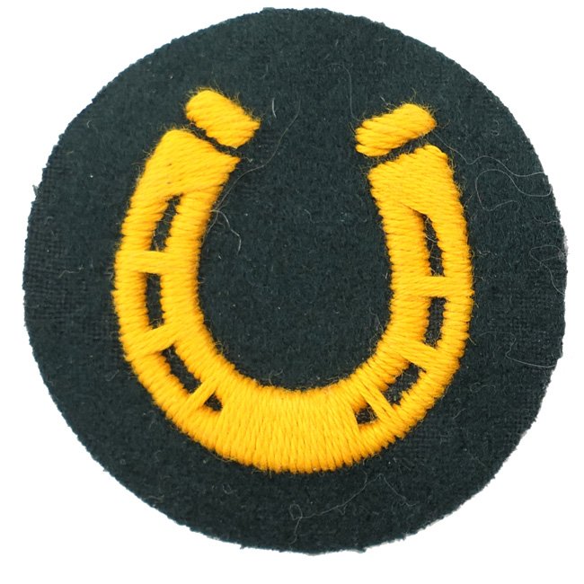 Wehrmacht (Heer) qualified 'Hufbeschlagpersonal' (Farriers) trade- & special career insignia (Tätigkeitsabzeichen). The patch is showing a neatly hand-embroidered 'horseshoe' (indicating farrier) in golden-yellow linnen on a dark-green wool base. The patch has a grey backing cloth and is nicely maker marked on the back. Nice example in good unissued condition!