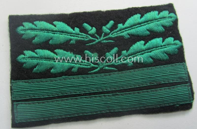 This is an attractive - truly used and/or worn albeit regrettably single! - officers'-pattern, WH (Heeres o. Waffen-SS) rank-insignia-bar (ie. 'Rangabzeichen für die Tarnuniform') as was intended for usage on the various camouflaged-uniforms by a fairly high-ranked officer holding the rank of an: 'Oberstleutnant' (ie.: 'SS-Obersturmbannführer') being a typical, machine-stitched (ie. embroidered) example as was executed on typical black-toned and/or smooth-type wool and that comes in an overall nice- (ie. I deem most certainly used- and/or carefully tunic-removed-), condition. The neat piece - which is of the 'embroidered-pattern' as executed in bright-green-coloured linnen-based material - show two embroidered oakleaf-bars and double square-sized (and additionally-attached!) rank-bars signifying that this patch was intended for usage by an officer holding the rank of an: 'Oberstleutnant' (ie.: 'SS-Obersturmbannführer'). The neat piece is just a tiny bit stained ie. wrinkled caused by decades of storage and wear but is still nicely preserved over the years (as can be seen on the pictures). Simply an attractive - and actually not that often encountered! - embroidered-styled, WH (Heeres o. Waffen-SS) rank-insignia-bar that is with certainty accordingly priced!
