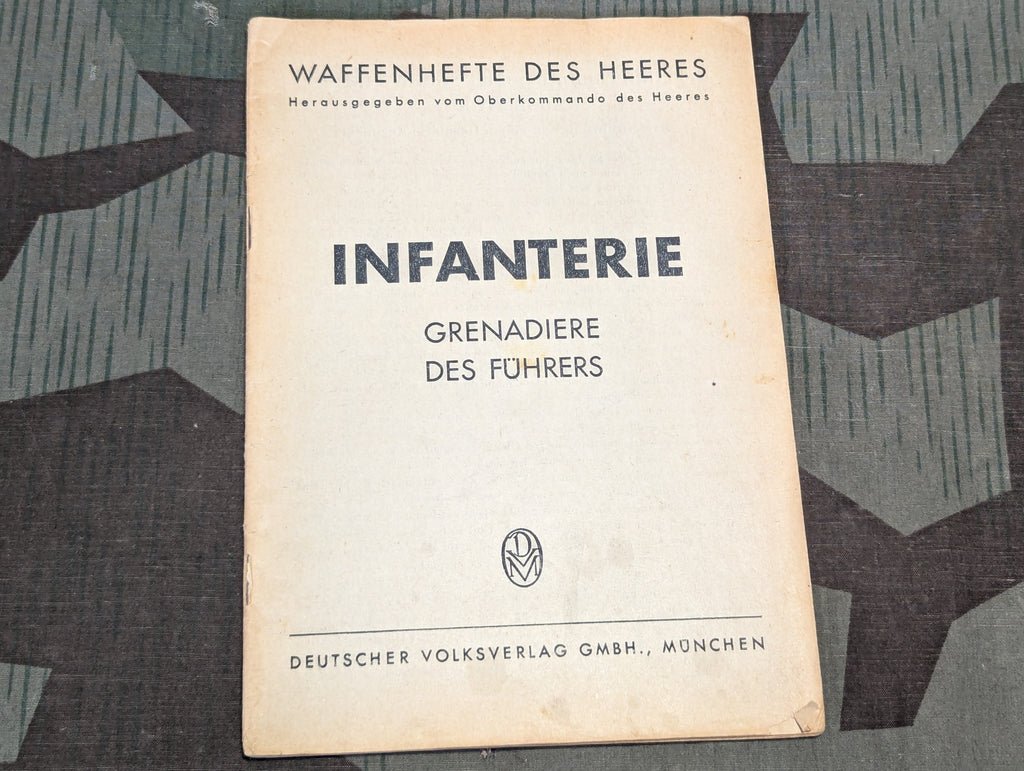 Interesting paperback book Infanterie Grenadiere Des FĂŒhrers Waffenhefte des Heeres distributed by the Oberkommando des Heeres. It has a lot of sketches and seems to be a very generic view of the infantry, their equipment, and vague tactics. It really reminds me of the sorts of books I would have had as a kid, I am not entirely sure of the intended audience, it feels like its meant for teenagers or kids to get them hyped up for the infantry. It is in fairly good condition.