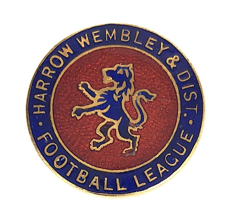 A good ORIGINAL circa 1950's period 'Harrow Wembley & District Football League buttonhole badge; gilt brass example inlaid with red and blue enamel the centre displaying a lion. Very good condition, complete with original buttonhole lapel fitting, no damage to the enamel.Diameter approx 22mm.