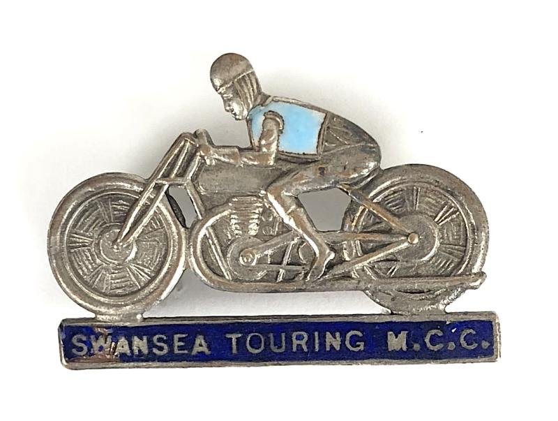 A rare original vintage period Welsh 'Swansea Touring M.C.C. pin badge'; oxidized silver plated motorcycle and rider displaying light blue breast plate and dark blue title bar. Good condition, complete with original pin fittings, actual pin an old replacement, minor enamel loss to title scroll..Size approx 35 x 24mm.